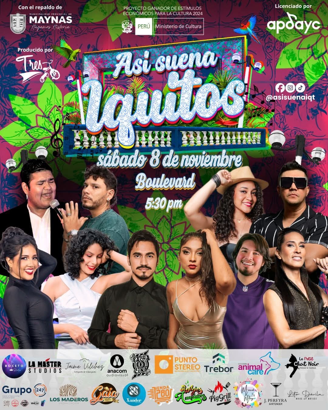 El concierto “Así suena Iquitos” es un proyecto ganador de los Estímulos Económicos para la Cultura 2024 del Ministerio de Cultura del Perú. Los organizadores agradecieron el apoyo de las instituciones, auspiciadores y equipos técnicos que hacen posible la realización del evento.