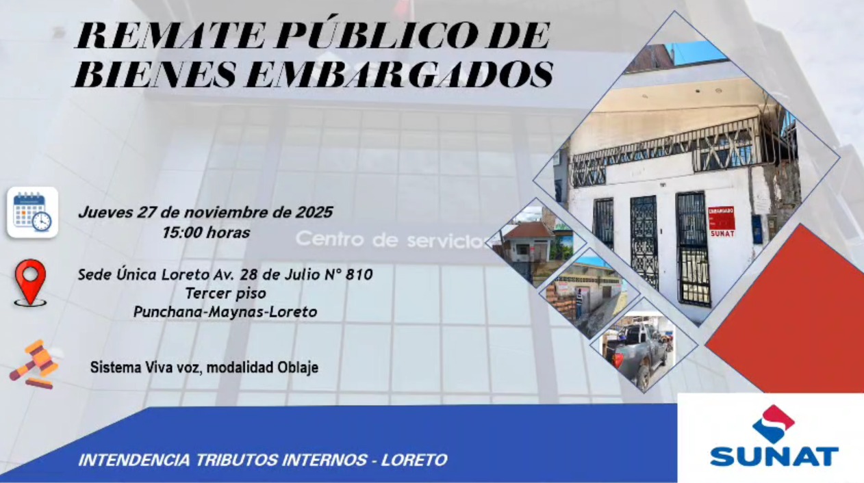 La ejecutor coactivo de la SUNAT, Lynda García Perea, informó que mañana jueves 27 de noviembre, a las 3 de la tarde, se llevará a cabo el último remate de bienes inmuebles del año 2025. La funcionaria destacó que los remates de SUNAT representan una oportunidad segura de inversión, pues todos los bienes se entregan con documentación saneada, libres de gravámenes y sin deudas tributarias. “Los contribuyentes pueden tener plena garantía de que adquieren propiedades listas para ser gestionadas sin ningún problema legal”, afirmó.