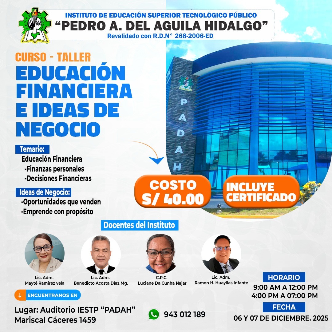 La docente CPC Luciene Da Cunha Najar, del Instituto de Educación Superior Tecnológico Público “Pedro A. del Águila Hidalgo” (IESTP PADAH), informó sobre la realización del curso-taller “Educación Financiera e Ideas de Negocio”, dirigido a estudiantes, emprendedores y público interesado en fortalecer sus capacidades para la toma de decisiones económicas y la creación de emprendimientos.