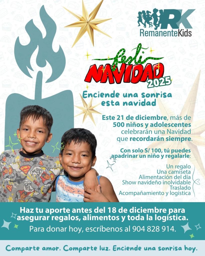 La organización juvenil Remanente Kids, representada por David Réategui, anunció la realización del evento “FestiNavidad”, una actividad solidaria dirigida a niños y niñas de sectores vulnerables de Iquitos, programada para el domingo 21 de diciembre, en el marco de las celebraciones navideñas.