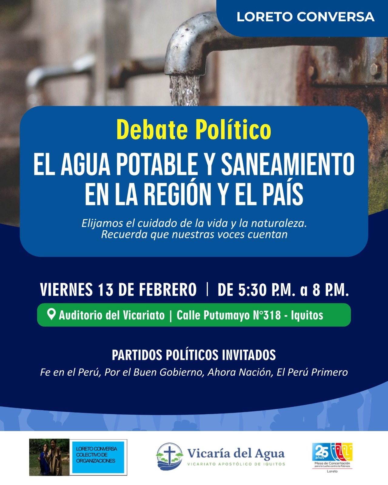 La actividad es organizada por la Vicaría del Agua, Loreto Conversa y la Mesa de Concertación para la Lucha contra la Pobreza, quienes invitan a la ciudadanía a participar activamente en este espacio de diálogo y reflexión política.