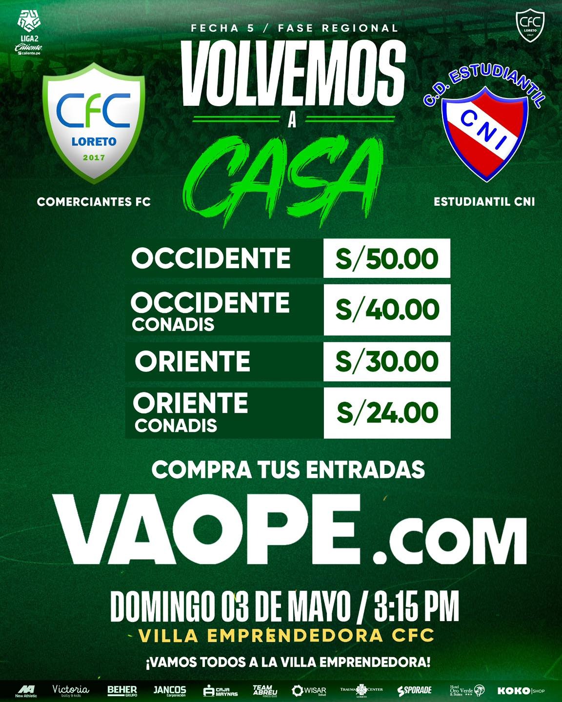 El gerente deportivo de Comerciantes Fútbol Club, Fred Pérez, confirmó que este domingo 3 de mayo a las 3:15 de la tarde se disputará un esperado encuentro frente a Estudiantil CNI por la quinta fecha de la Liga 2, en la Villa Emprendedora de los Padres Agustinos, en Iquitos.
